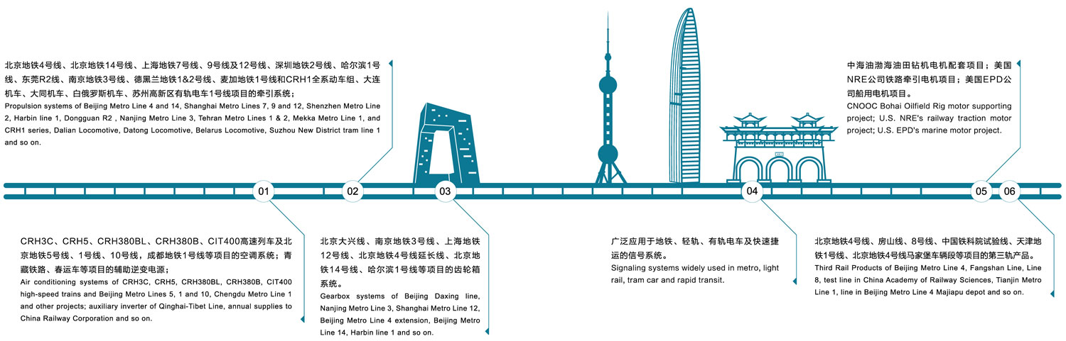 02.北京、上海、廣州、深圳、天津、成都、哈爾濱、南京、烏魯木齊、蘭州、廈門、東莞、佛山等20個(gè)國內(nèi)城市,和德黑蘭、麥加、曼谷等海外城市的地鐵,以及CRH1全系列動(dòng)車組,大連、大同、白俄羅斯機(jī)車,南京、蘇州有軌電車,上海自動(dòng)捷運(yùn)系統(tǒng),蕪湖單軌項(xiàng)目的車輛牽引系統(tǒng);